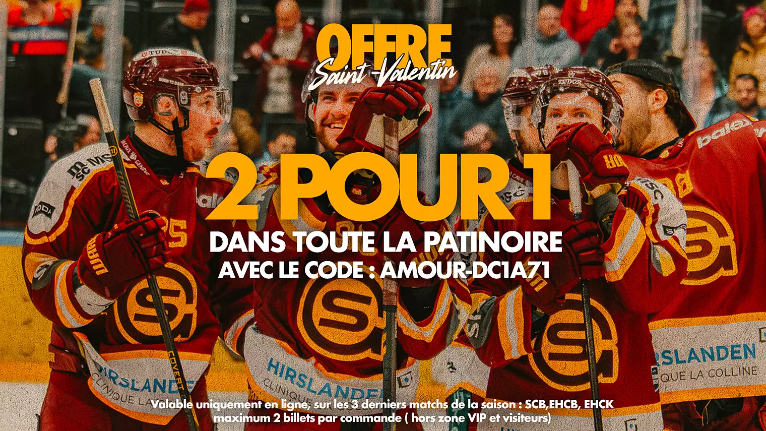 Le 14 février, profitez de notre offre spéciale 2 billets pour le prix d’1 dans toute la patinoire (hors zones VIP et visiteurs) et vivez un moment unique avec la personne de votre choix.