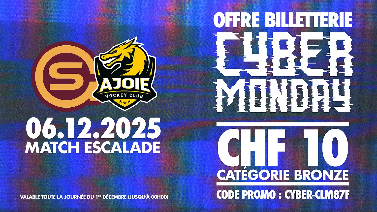 Pour le match GSHC vs HC Ajoie du 6 décembre prochain, profitez de CHF 10 de réduction en Catégorie Bronze grâce au code promo CYBER-CLM87F.
