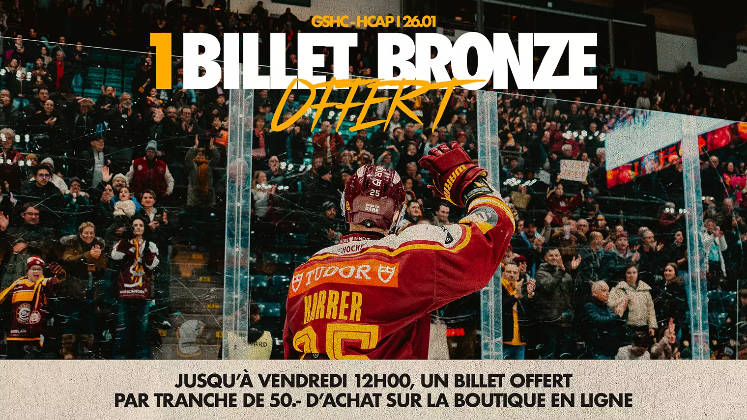 Bénéficiez d’une offre spéciale sur la boutique en ligne : 1 billet Bronze pour le match du 26.01 contre HC Ambrì-Piotta offert par tranche de CHF 50.- d’achat*